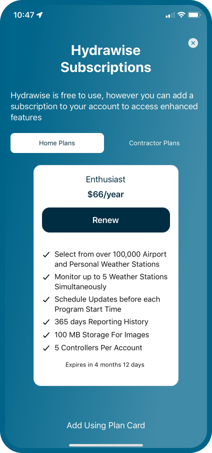 نظام إدارة الري Hydrawise مجاني لمعظم المستخدمين في جميع أنحاء العالم، وإن رغب العميل في إضافة المزيد من التحسينات لنظامه؛ لتعزيز قدرات توفير المياه، توفر خطة Hydrawise Enthusiast ميزات إضافية له، مثل القدرة على الوصول إلى مزيد من محطات الطقس، وأوقات أطول لتخزين البيانات، وتنبيهات رسائل قصيرة، وتحديث دائم لبيانات أحوال الطقس.