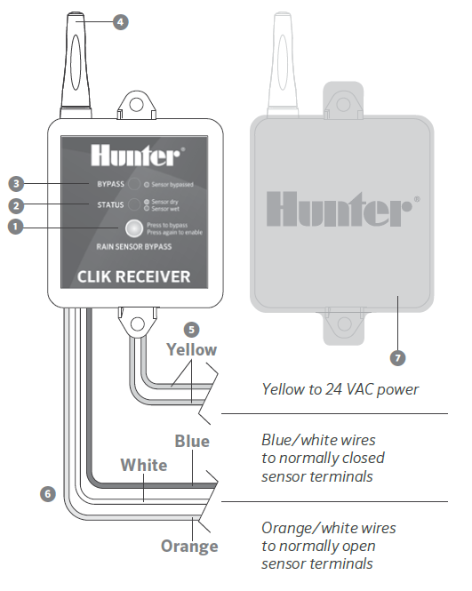 - 蓝/白线:用于常闭式传感器应用(Hunter 控制器)。