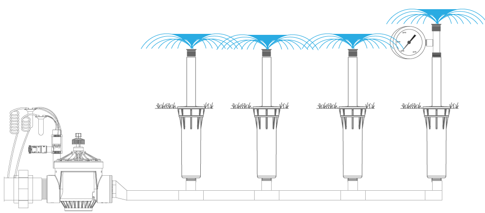 Der Accu-Sync vergleicht den Druck auf der Oberseite der Membrane (Druck der Hauptwasserversorgung) mit dem Druck auf der Unterseite. Der Druck wird eingestellt, indem das Gerät die Membran nach unten drückt, bis der gewünschte Druck erreicht ist. Der Accu-Sync passt sich automatisch an Änderungen des Hauptwasserdrucks an. Um den dynamischen Druck (Betriebsdruck) an der Nebenleitung mit installiertem Accu-Sync richtig einzustellen, empfehlen wir Ihnen, unser MP-Manometer am letzten Kopf der Leitung zu verwenden. Sie können ein Hunter MP-Manometer kaufen (unten am weitesten oben abgebildet), um den Druck genau zu überprüfen.
