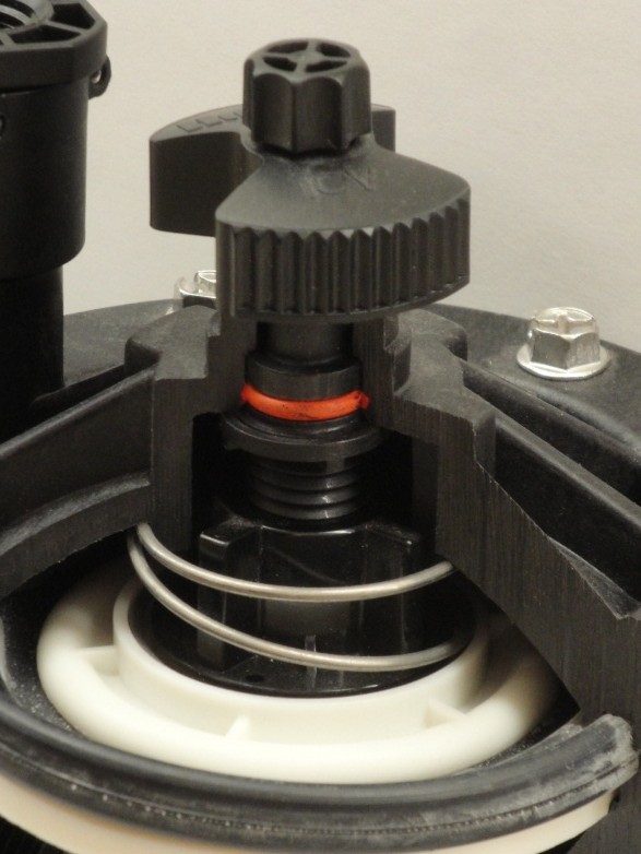Der Durchflussregler funktioniert ähnlich wie ein Schlauchhahn oder ein Absperrschieber, da seine Hauptfunktion darin besteht, die Wassermenge, die durch das Ventil fließt, entweder vollständig zuzulassen oder zu begrenzen. Der Hauptunterschied besteht darin, dass die Durchflusskontrolle den Hub der Membrane begrenzt, so dass weniger Wasser durchgelassen wird. Dies wiederum führt zu einem zusätzlichen Druckverlust, so dass Sie die Leistung Ihrer Regner „feinjustieren“ können. Ein vollständig geöffnetes Ventil kann mehr als 75 PSI (5,17 bar/517,12 kPa) durchlassen, was für bestimmte Regner, wie z. B. Sprühversenkregner, zu viel ist. Mit der Durchflusskontrolle können Sie den Durchfluss und den Druck auf ein kontrollierbares Niveau begrenzen. Wie Sie in diesem Ventilausschnitt sehen können, ruht die Durchflusskontrolle buchstäblich auf der Oberseite der Membran, um den Hub der Membran zu steuern. |