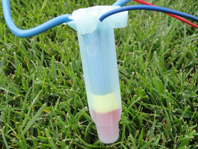 Benutzen Sie wasserdichte Kabelverbinder, um die Drähte der Magnetspule mit dem Niederspannungs-Bewässerungsdraht im Ventilkasten zu verbinden.