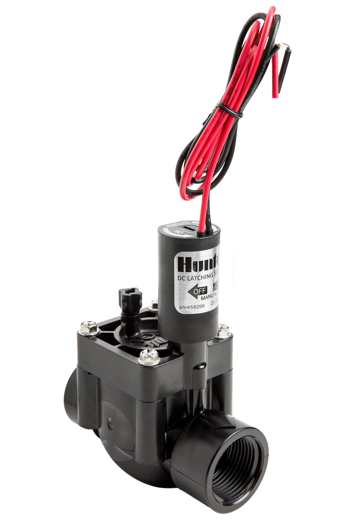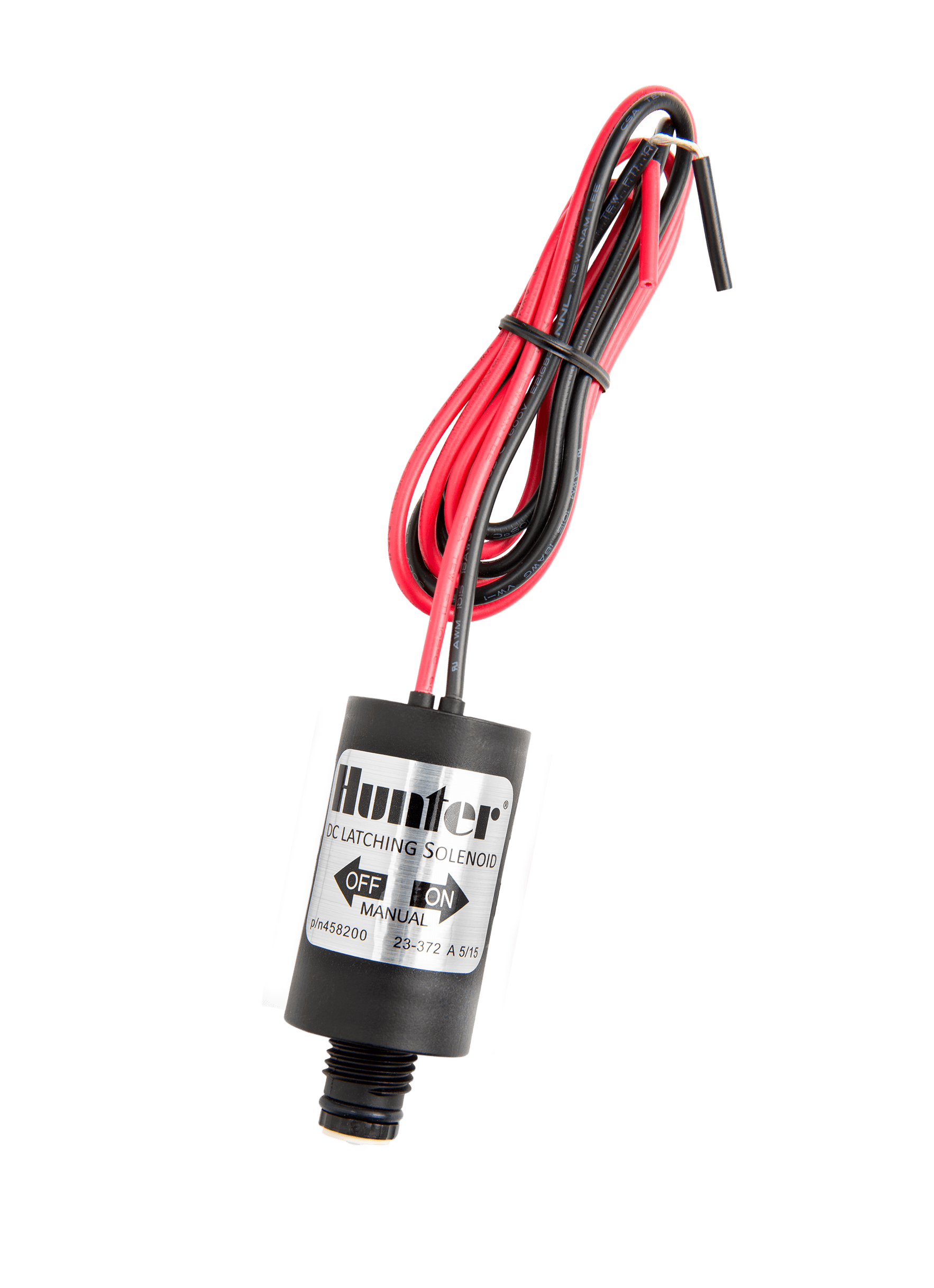 The 9 V Hunter DC-Latching Solenoid is compatible with all plastic Hunter valves used with battery-operated controllers. The solenoid receives a quick pulse from the controller to latch (open the valve) and unlatch (close the valve). The solenoid has one black common wire and one red station wire. To ensure reliable operation, the wires must always be connected properly.