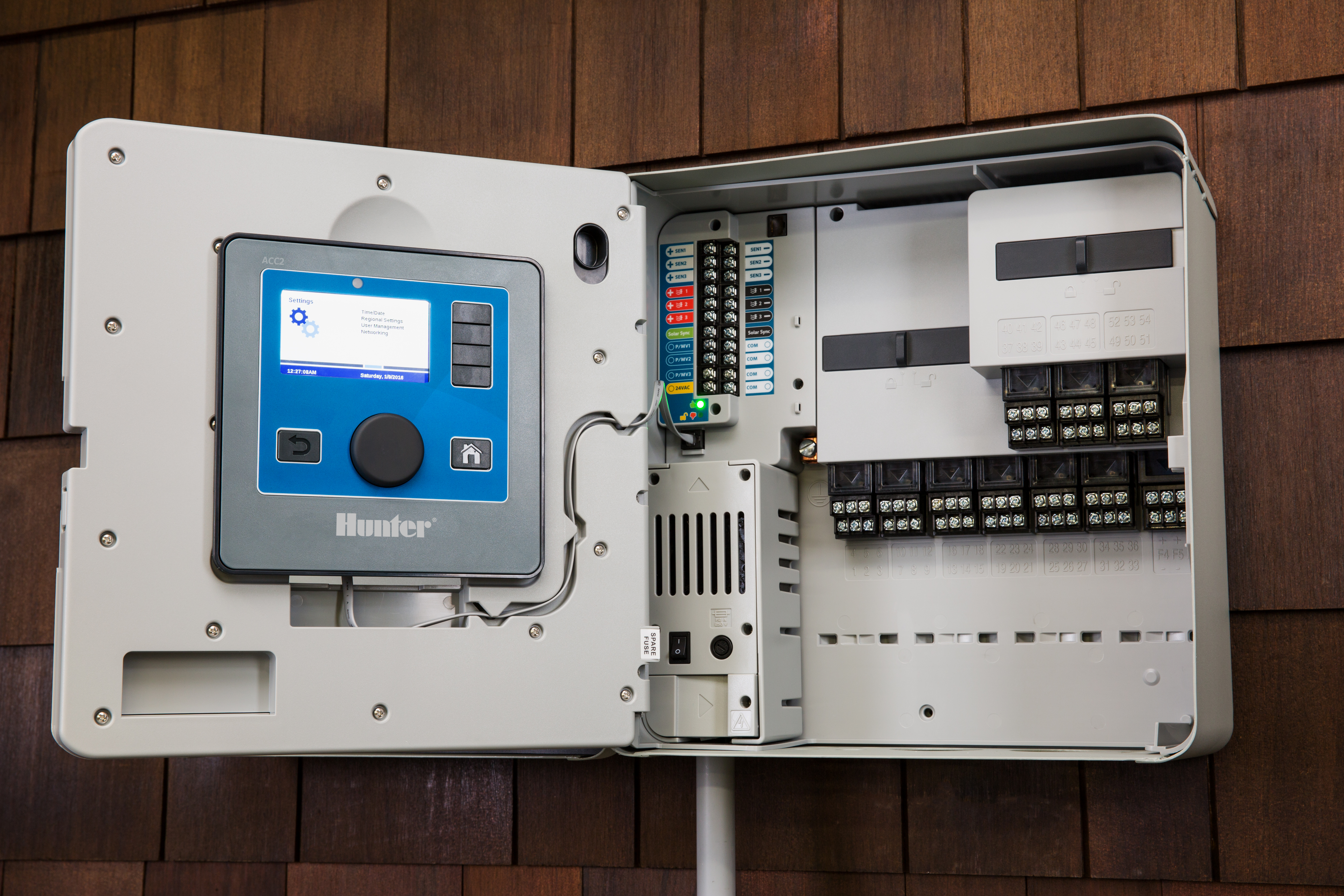 The ACC2 has built-in intelligence, with the ability to schedule stations on up to 6 flow zones simultaneously. It continually monitors the system for breaks, leaks and electrical faults, suspending irrigation and pinpointing the source should problems arise. It can even respond to sensor input with specific actions like switching water supplies when water levels drop, or initiating a program when soil moisture is low, and other creative special applications.