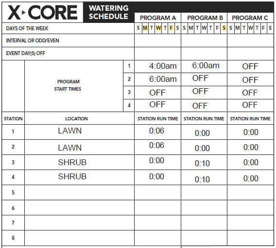 You have a 4 Station X-Core controller. Your lawn stations are valves #1 and #2. Your shrubs stations are valves #3 and #4. You want the lawn stations to water Monday, Wednesday, and Friday at 4:00am and again at 6:00am for 6 minutes per station. Then you want the shrub stations to water on Saturdays at 6:00am for 10 minutes per station.