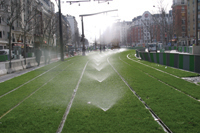 In addition, Tram Baix in Barcelona, Spain is a public transportation system that features more than 8 km of turf surface. The lines are double rail (go and return) with a width of 12 m that is planted with grass. The irrigation system includes PGP® rotors (with purple cover to indicate recycled water use) and square pattern spacing (face-to-face) of 12 m. The future of mass transit in European cities is looking greener and quieter.