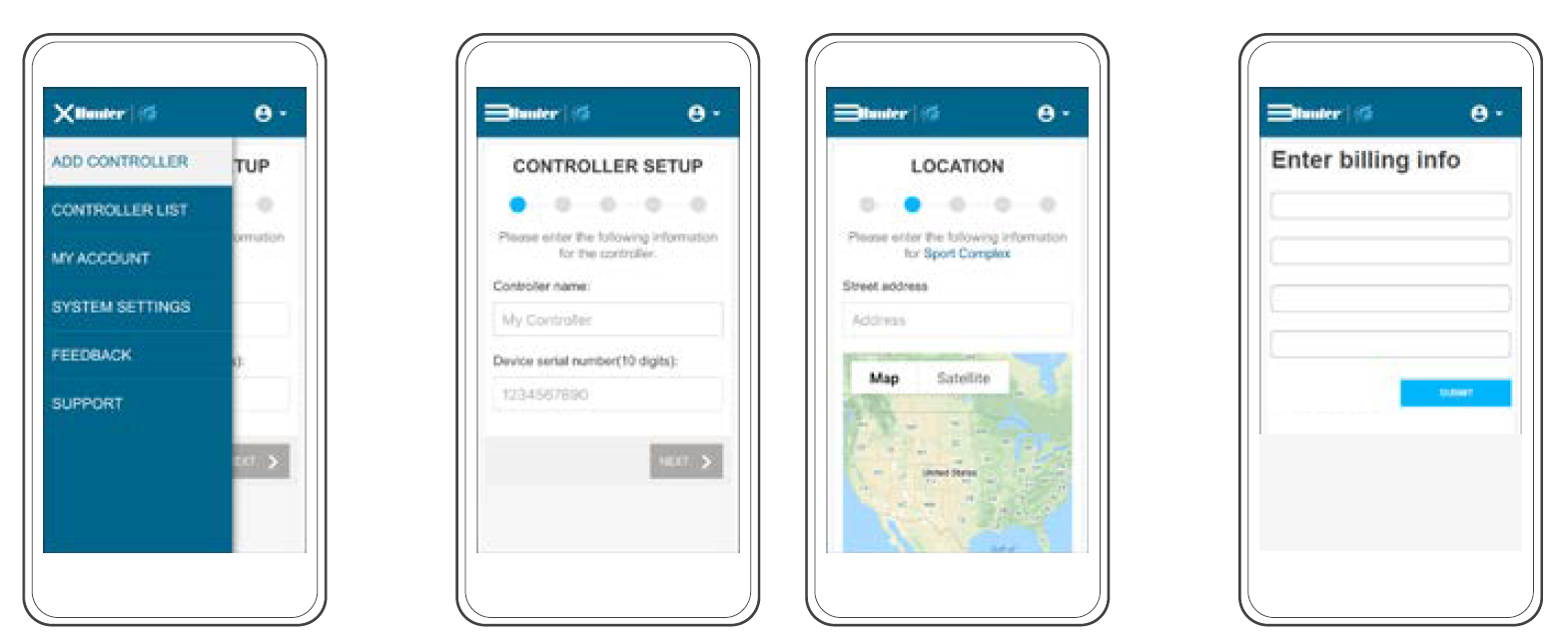 The serial number is printed on the module, and is also visible on the controller’s Network Info screen. Enter all zeroes that are included in the serial number and click Next. Enter a valid address for the controller location, and choose the connection type. You must select CELLULAR or you will be unable to complete the setup successfully. The setup process will continue to the billing and activation screen via Hunter’s secure, third-party cellular service provider. You will return to the setup process when this step is complete.