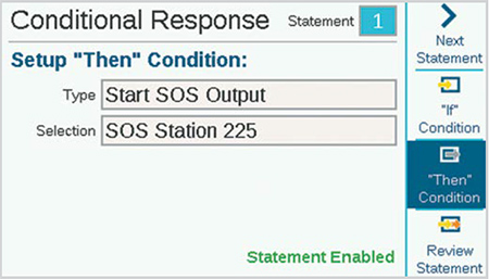 In the Conditional Response screen, set an "If" condition first, set to Any Alarm or Critical Alarms. Use the "Then" soft key to select a "Start SOS Output" Type.