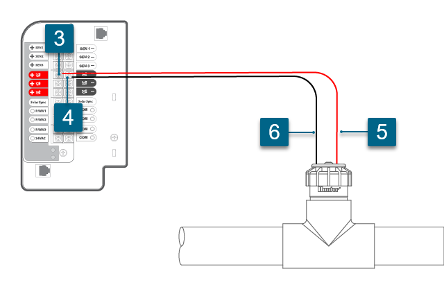 5. Connect RED Flow Sensor wire to the field cable going to 1 RED (+). Seal with included waterproof connectors.