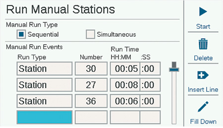 Specify one or more stations to run and enter a run time for them. You can also choose to run them simultaneously, rather than sequentially, if you check the Simultaneous box. Press the Start key to start the list.