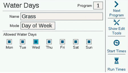 Verify you are in the correct program by number or name, and set the days for automatic watering.