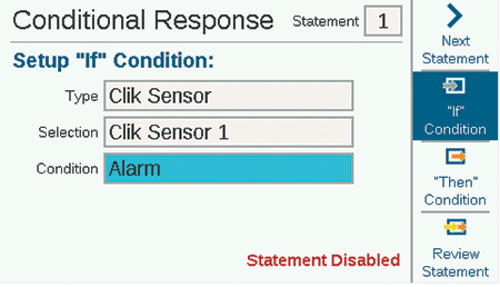 Dial to Advanced Settings and select Conditional Response. Each response has a soft key for the “If” condition, a “Then” condition or action, and “Review Statement” to verify that the complete response will meet the goal.