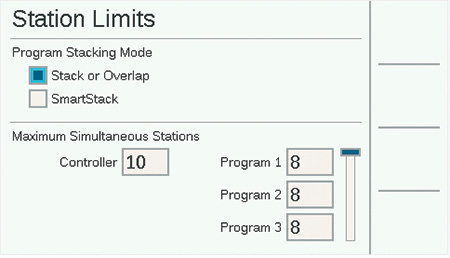 If Flow Manager is enabled, the display will also show Program Limits. This sets the max number of stations that can run within any one program. This might be used to force irrigation to be spread over a larger number of programs, when Flow Manager is scheduling stations on to reach a flow rate target.