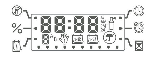 | Program Designator – identifies program in use (A or B). Flashing Sprinkler – indicates that watering is occurring. | |