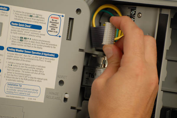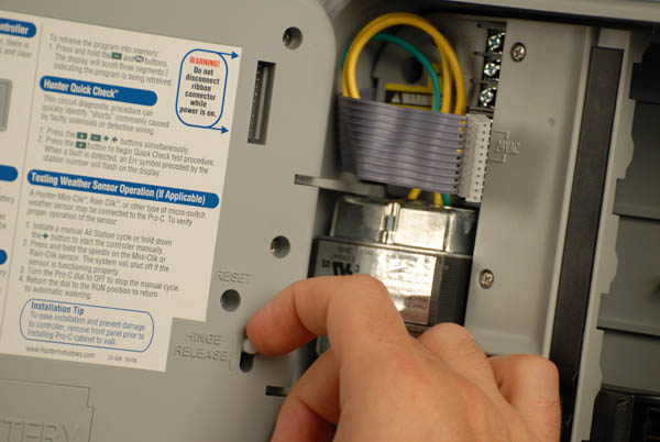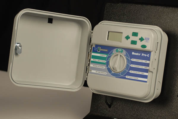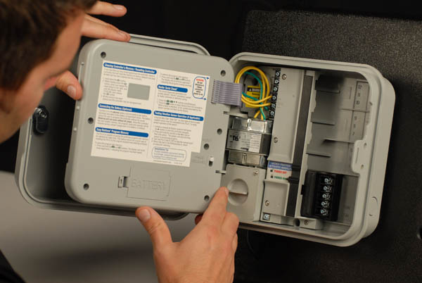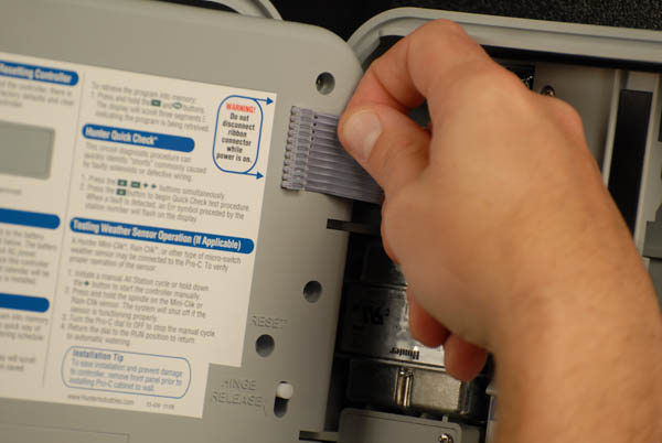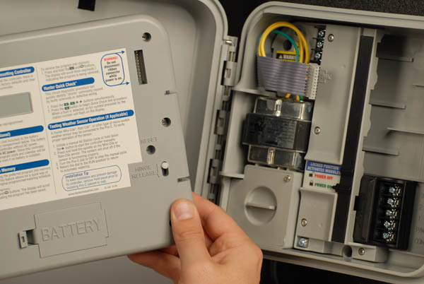 To remove the Pro-C's front panel, start by removing all power from the controller. Unplugging the transformer or shutting off the circuit breaker will be necessary to do this properly. | Open the front panel similar to how the controllers door opens, this should expose the battery compartment on the back of the front panel. |