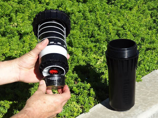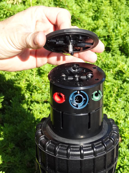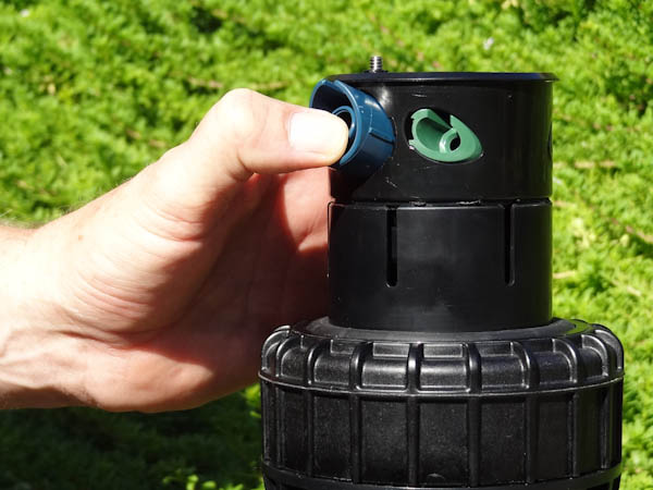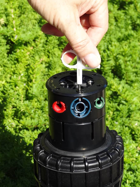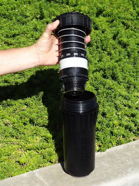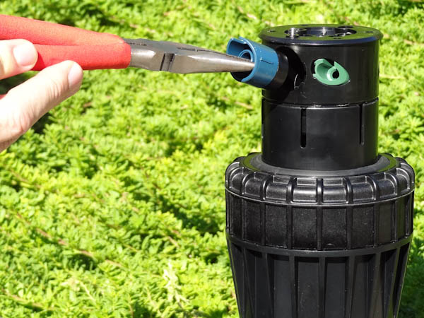 If the right side of the arc is not properly aligned, the results may be a wet walkway or a dry turf area. The right side can easily be realigned. One way to realign the right stop is to unscrew the body cap counterclockwise and remove the internal assembly from the body. Once removed, rotate the nozzle turret to the right stop, insert the internal assembly back into the body with the nozzle aligned to the right side of the area you want irrigated. At this point you realigned the right arc stop, and you can adjust the left arc to an appropriate setting.