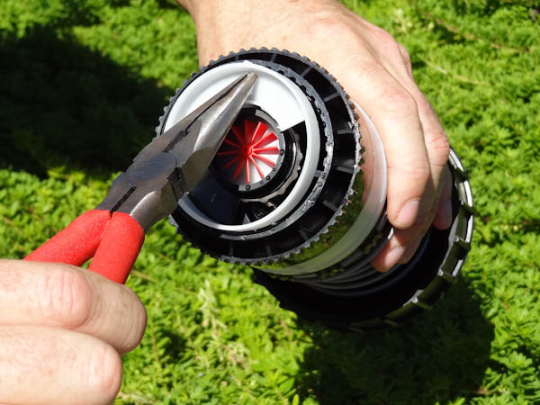 The nozzle is retained in the nozzle housing by a setscrew. Back out the setscrew using the hex key on the Hunter wrench to allow for nozzle removal. | Grasp the nozzle with pliers and pull to remove. |