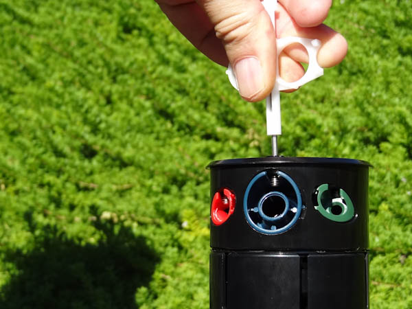 Insert the replacement nozzle in the housing. Press firmly to fully seat the nozzle so that it will clear the retaining setscrew. | Using the hex key on the Hunter wrench, turn the setscrew down to retain the nozzle. Replace logo cap and the central phillips screw. |