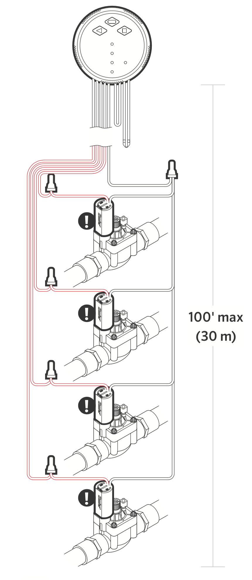 Attach one red wire from each solenoid to the corresponding station wire (red lead) from the NODE-BT. The station numbers are identified underneath the red wires of the NODE-BT. Secure all wire connections with waterproof connectors.