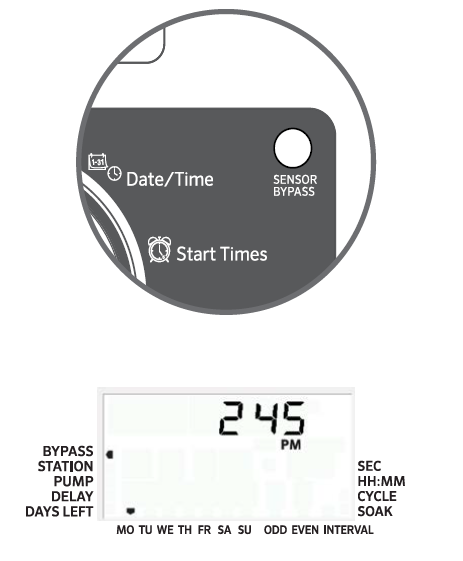 If the rain sensor is interrupting irrigation, you can bypass it by using the bypass switch on the front of the controller. Press the Sensor Bypass button to temporarily bypass the sensor status and allow normal controller operation. The Bypass switch will remain active for a maximum of 24 hours