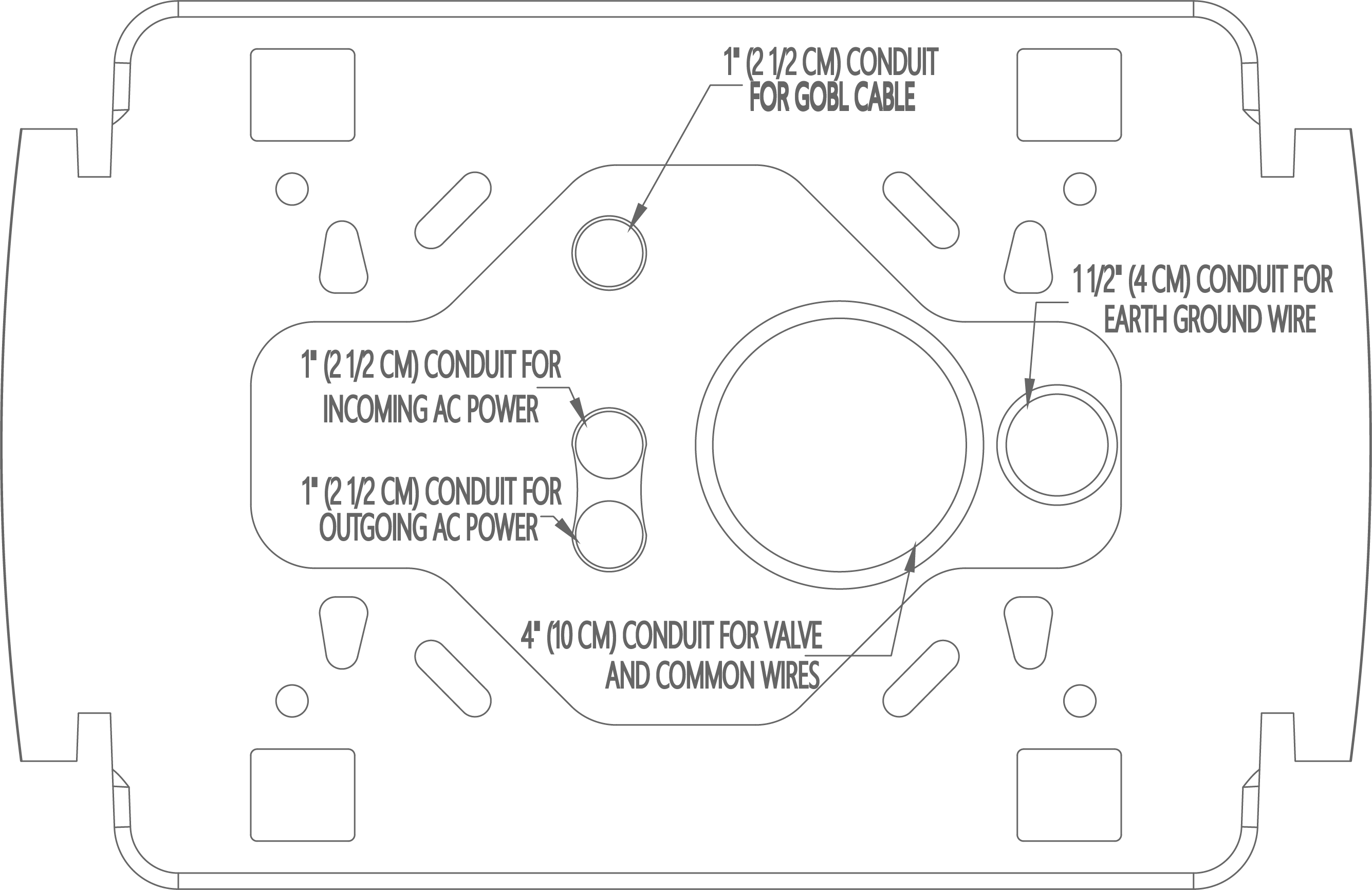 - If the controller is linked to a central computer by wire, position a 1” (2.5 cm) conduit sweep elbow for the GCBL cable as shown below.