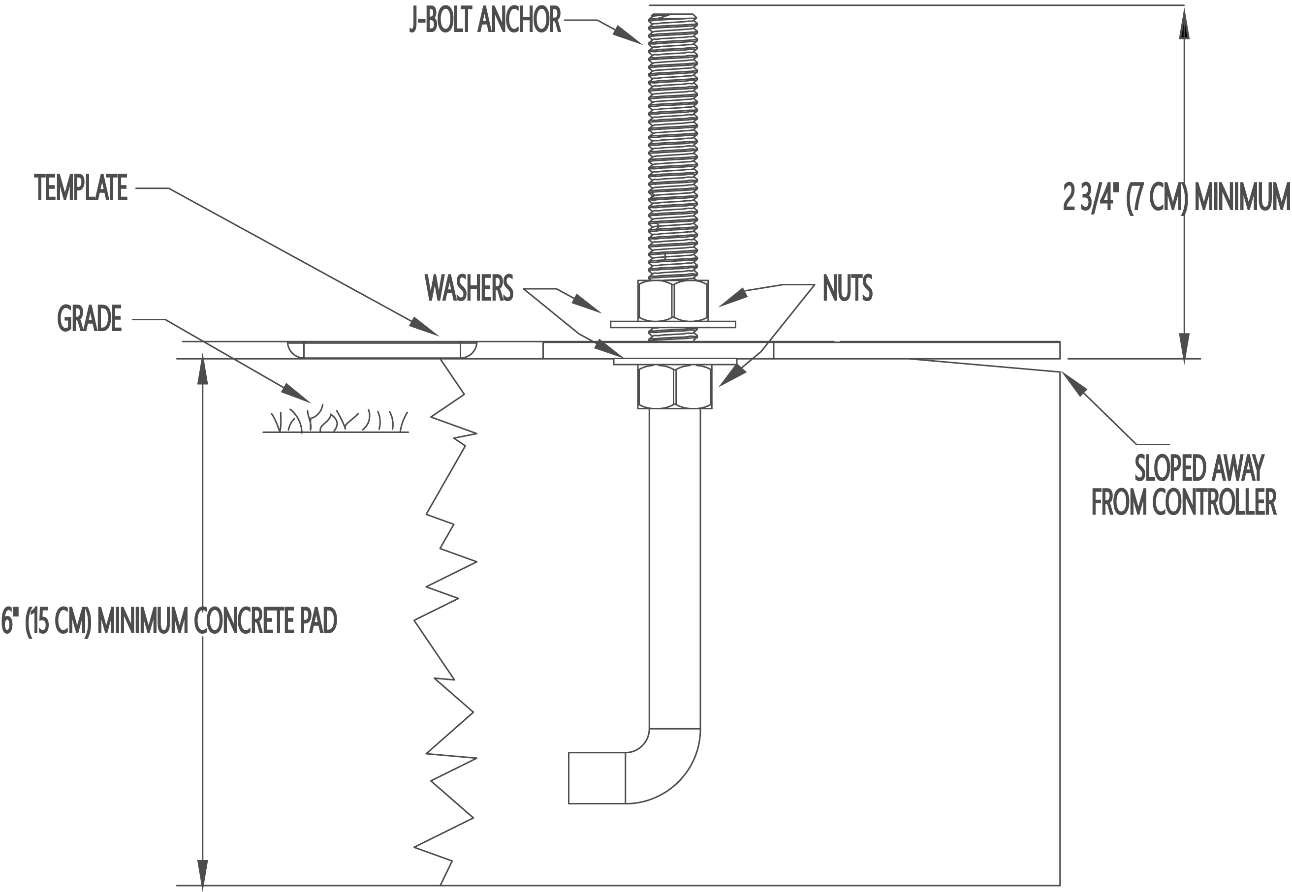 - Assemble the J-bolts and washers and nuts onto the template. A minimum of 2.75” (7 cm) of thread must protrude above the surface of the pad. The washers and nuts will hold the J-bolts in place so they remain in position while they are lowered into the concrete.