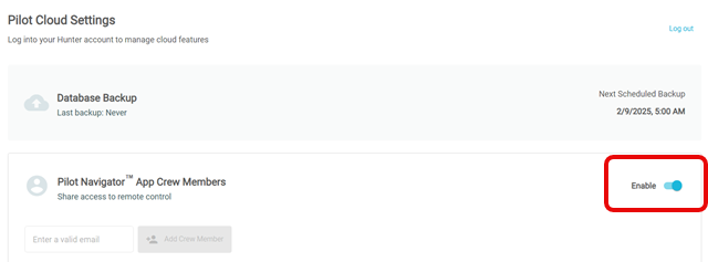From Pilot CCS go to Settings and enable Database Backup and Pilot Navigator App Crew Members. Database backup will prompt you to enter your Hunter SSO account login credentials.