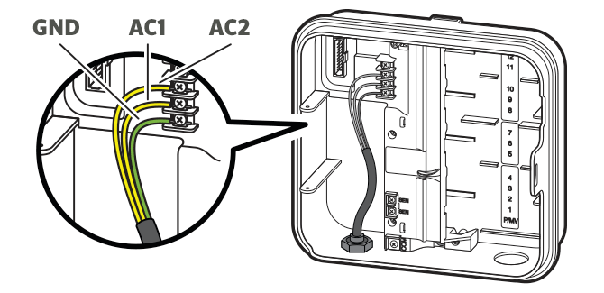 Route the transformer cable through the hole on the bottom left side of the controller and connect one Yellow Wire to each of the screws marked 'AC' and the Green Wire to GND.