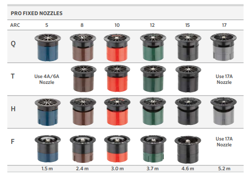 Hunter's Pro Fixed 8' (2.5 m), 10' (3 m), 12' (3.5 m), and 15' (4.6 m) Nozzle distances include the less common third arc pattern for even more design flexibility. These fixed arc nozzles are designed for accurate irrigation of a variety of landscape shapes and sizes.
