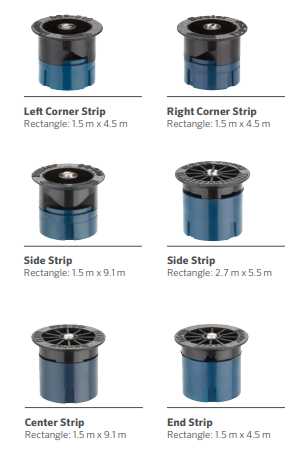 To accommodate the needs of narrow planting areas, Hunter offers a wide variety of fixed-arc strip nozzles. The Strip Pattern Nozzles are designed to ensure accurate coverage of rectangular areas with models including right and left corner strips, center and end strips, and two options for side strips.