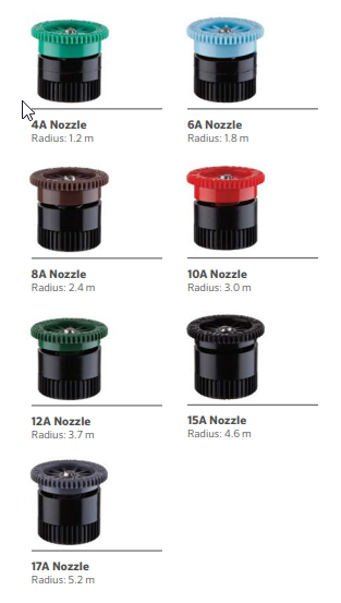 | 12A | Pro Adjustable Nozzle, 3.5 m radius, 0° to 360° adjustable arc, Dark Green |