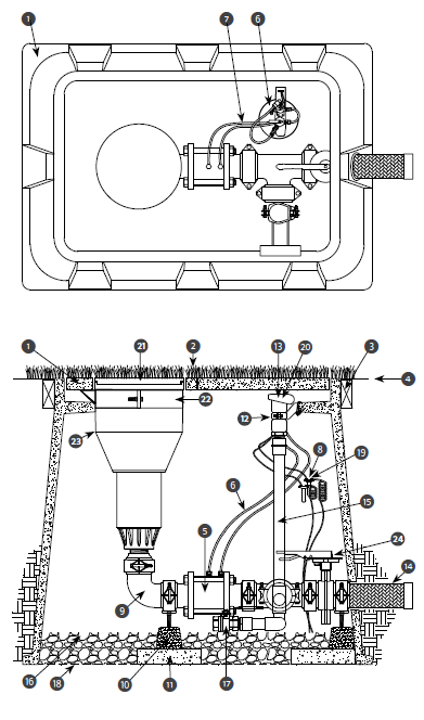 | 1 | Hunter ST-243636-B composite vault and four–piece polymer–concrete cover set with cast–in openings to support rotor lateral thrust, plus cast-in opening with circular covers for quick coupler and on–off– auto access |