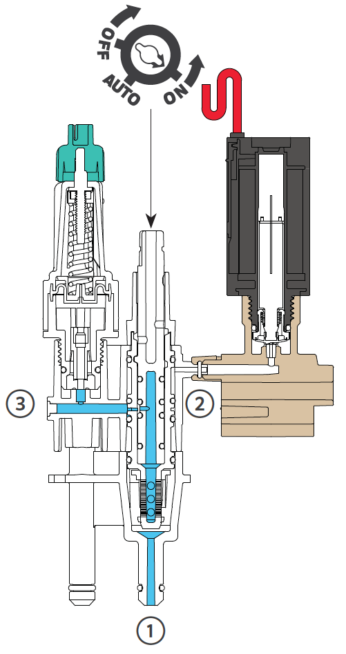 (4) Flow exiting manifold assembly and returning to serviceable inlet valve
