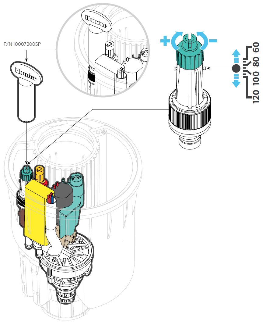 Rotate the top teal colored knob counterclockwise to reduce pressure from 60 to 120 PSI (4.1 to 8.3 bar; 410 to 830 kPa). Rotate the teal knob clockwise to increase pressure.