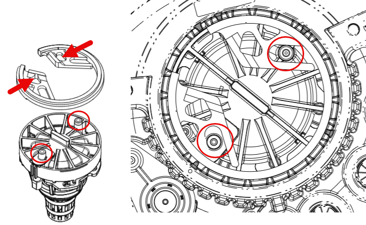 - With the inlet valve pliers (P/N 475600SP) squeeze the opposing tabs on the snap ring and lower the snap ring into the snap ring groove above the inlet valve. Pay attention to the snap ring alignment slots as they must fit through the protruding bosses on top of the inlet valve.