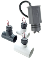 The Hunter Flow Sensor body (FCT or Flow Clik Tee) is designed in diameters from 1" to 4"(2.54-10.16cm). It is installed into the mainline of the irrigation system, near the point of connection. It is important to install the Sensor Assembly (FCT + HFS) downstream of the master valve. Also, it is necessary to install the Sensor Assembly in an area of low turbulence within the system. Areas of high turbulence will cause erratic readings from the Flow Sensor. The figure below represents a recommended sensor assembly installation. There must be at least 10 times the pipe diameter of straight pipe upstream of the Sensor Body inlet and at least 5 times the pipe diameter in length of straight pipe downstream of the Sensor Body outlet. This will assure that the HFS is placed in the optimum position within the irrigation system. HFS sensors have a red and black wire which connect to the corresponding terminals in the controller. The wires may be extended up to 1000 ft/300 m from the controller if necessary. Be sure to keep the red and black wires straight, when connecting to an ACC controller. |
