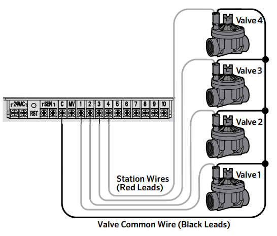 - At valves, attach a common wire to the black solenoid wire on all valves. Attach a separate control wire to the remaining red wire of each valve. All wire connections should be done using waterproof connectors.