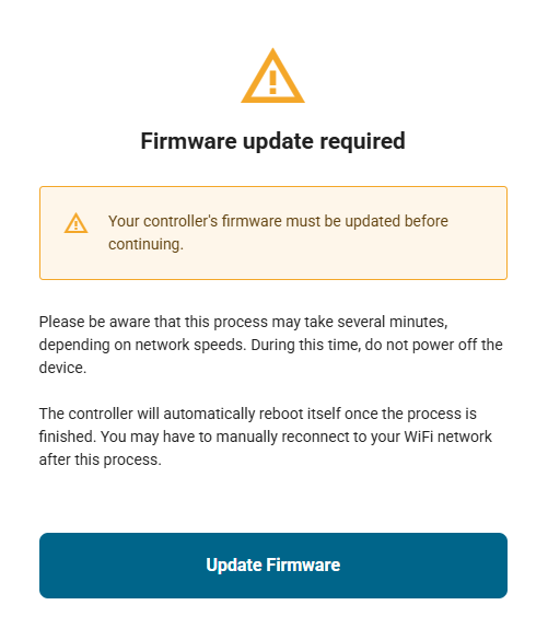 El firmware es el sistema operativo de software dentro de un programador o módulo de red. El Centralus™ requiere el sistema operativo más reciente para un rendimiento óptimo. Si detecta una versión anterior del firmware en el programador, el software le pedirá que actualice el firmware de forma inalámbrica. No podrá utilizar el programador desde Centralus™ hasta que no se haya actualizado el firmware.
