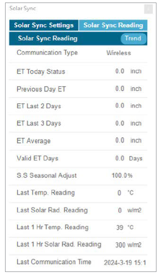 La lectura de Solar Sync proporciona los valores del ajuste estacional anterior de Solar Sync, la ET media, la ET actual/de los últimos tres días, la última lectura de temperatura, la última radiación solar y la lectura de temperatura/radiación solar de la última hora. La hora de la última comunicación representa la última vez que el programador actualizó estos valores en el software Hunter 360.