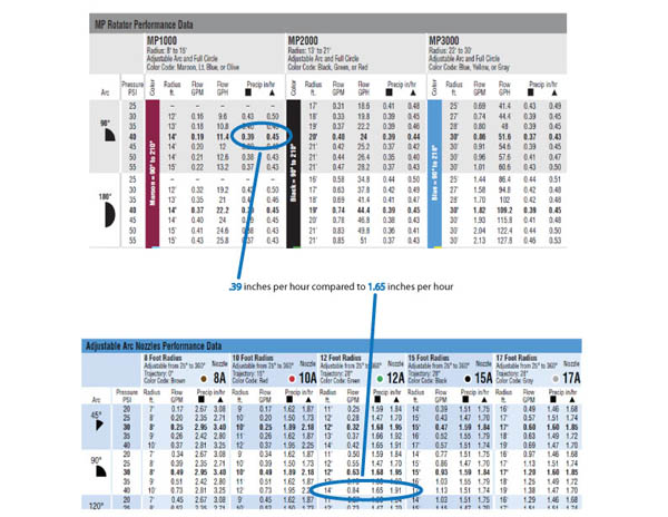 El MP Rotator tiene una pluviometría más baja que los cabezales difusores convencionales, por lo que sus tiempos de riego deben alargarse. Los tiempos de riego con el MP Rotator pueden duplicarse o triplicarse en comparación con un difusor estándar. Esto se debe a que el MP Rotator riega con una pluviometría más lenta, lo que deriva en una reducción significativa de la escorrentía, lo que a su vez ahorra grandes cantidades de agua. |