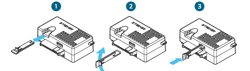 Retirez le couvercle anti-poussière ou le module précédent, à l'arrière et au bas de la façade du programmateur. Appuyez sur le bouton à ressort et tirez vers le bas pour retirer l'élément. Faites glisser le nouveau module jusqu'à ce que le verrouillage s'enclenche.