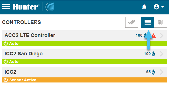 La liste des programmateurs indique également le nom et l'adresse des programmateurs, ainsi que l'état du réglage saisonnier. Si le programmateur est réglé manuellement, le pourcentage indique le dernier réglage envoyé vers celui-ci ou réglé sur son panneau avant. Si le programmateur dispose d'une sonde Solar Sync, le réglage s'effectue automatiquement au niveau de celui-ci et l'écran affiche le réglage saisonnier en cours.