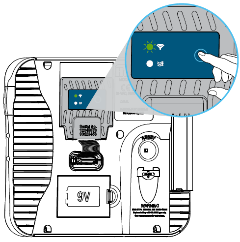 Appuyez sur le bouton de mise en service du module PC-WIFI (comme illustré) pour activer la connexion à Internet. Le voyant sur le panneau avant du Programmateur Pro-C™ et le voyant supérieur sur le module PC-WIFI commenceront à clignoter en VERT.
