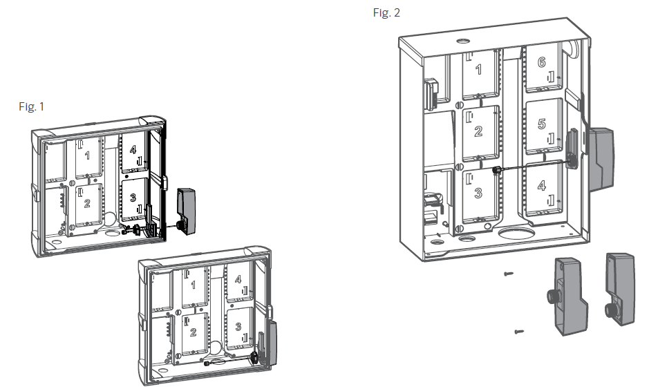 - Pour les installations de programmateurs ICC2 en plastique, ouvrez l'ouverture défonçable située dans le coin inférieur droit du boîtier du programmateur (voir fig. 1). Pour les installations de programmateurs ICC2 en métal, retirez le bouchon en caoutchouc situé sur le côté droit du boîtier.
