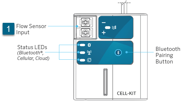Les fils rouge et noir de la sonde de débit sont raccordés aux bornes à vis + (rouge) et − (noir) du module de communication (voir fig. 1). Un fil de calibre 18 minimum peut être utilisé pour raccorder la sonde au module. Pour plus d'informations sur l'installation de la sonde sur site, cliquez ici.