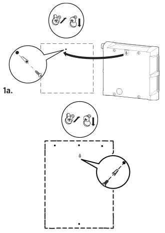1a. Basez-vous sur le patron fourni pour marquer l’emplacement des trous de montage et pour percer ces trous. Laissez suffisamment d'espace libre pour pouvoir ouvrir le panneau d’accès. Au besoin, prévoyez des chevilles pour les vis. Installez d'abord la vis centrale supérieure, en laissant un jeu de 6 mm entre la tête de cette vis et la paroi.