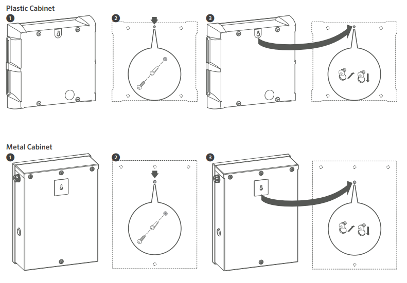 - Usare il modello di foratura incluso per contrassegnare e trapanare i fori di montaggio. Prevedere uno spazio sufficiente per aprire lo sportello. Utilizzare tasselli, se necessario. Installare prima la vite centrale superiore e lasciare la testa della vite a una distanza di 6 mm fuori dal muro.