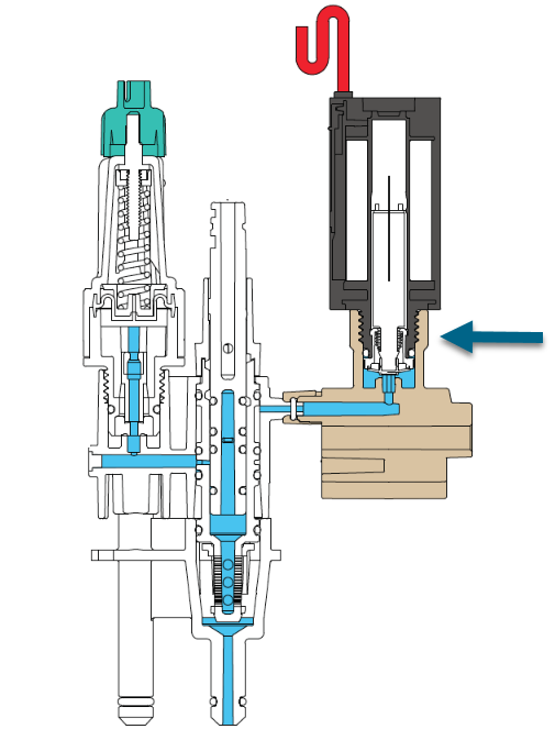 Assicurarsi che il gruppo della staffa della valvola pilota (blu) sia posizionato e montato correttamente. Se non è montato correttamente, può tirare o spingere sulle porte di scarico della base del solenoide.