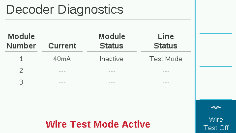 The WIRE TEST Feature will activate a 24 VAC-60 Hz frequency on all output modules and their two-wire paths, to allow wire tracking and fault finding with a standard AC current clamp meter. This is a common diagnostic technique to find shorts to earth ground. The AC current will drop sharply between two points on the wire path if a short circuit or fault to earth is between them. When troubleshooting is finished, press the soft key again to turn off the 60 Hz wire test mode.