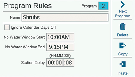 Wprowadź początek i koniec okresu dnia, w trakcie którego nawadnianie automatyczne nigdy nie będzie dozwolone. Programy automatyczne nigdy nie zostaną uruchomione w tym okresie, jednak będzie możliwa ich obsługa ręczna. Jeśli program zostanie zawieszony za pomocą funkcji Brak nawadniania, zostanie to zarejestrowane jako alarm w celu podjęcia działań naprawczych.