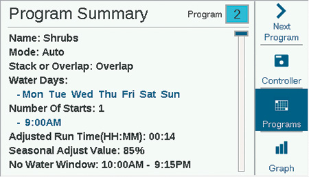 Po skonfigurowaniu czasów startu, czasów pracy i dni nawadniania program będzie działał automatycznie bez dalszej konfiguracji. Aby zobaczyć, jak dany program został skonfigurowany, wybierz opcję Podsumowanie programu na ekranie Programowanie.